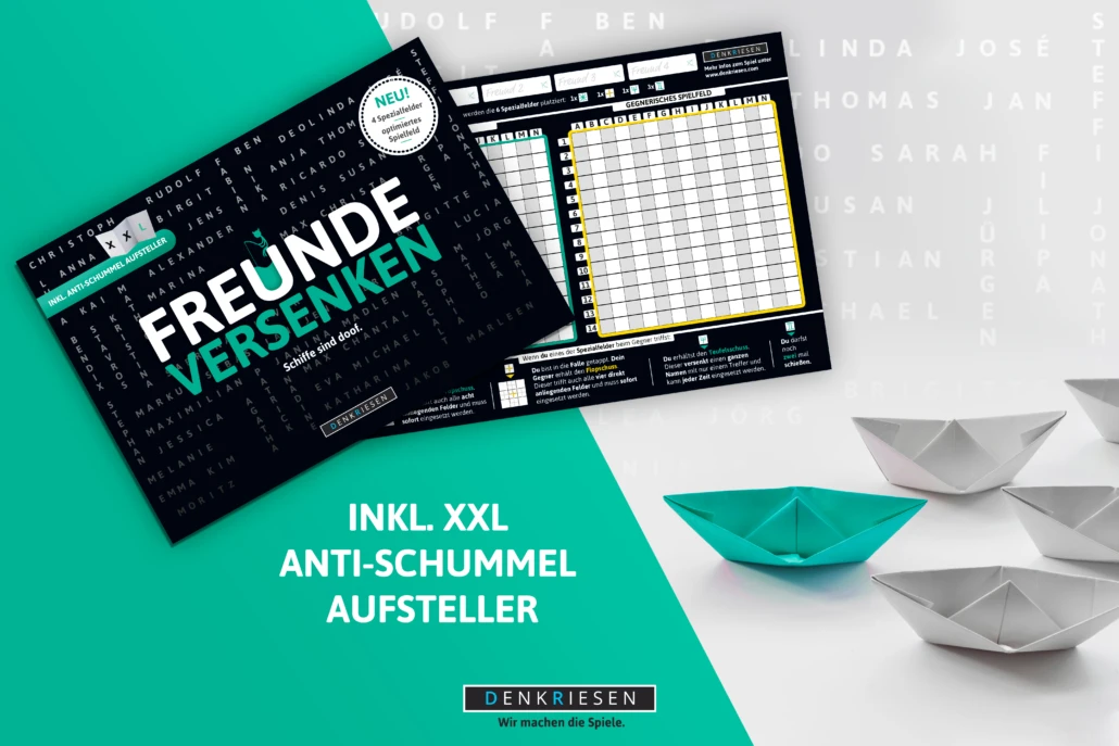 Freunde versenken wurde nach dem Spielprinzip von „Schiffe versenken“ entwickelt. Der ultimative Spielblock bietet neben einem XXL Aufsteller viele Variationen für ein spannendes Spielerlebnis.